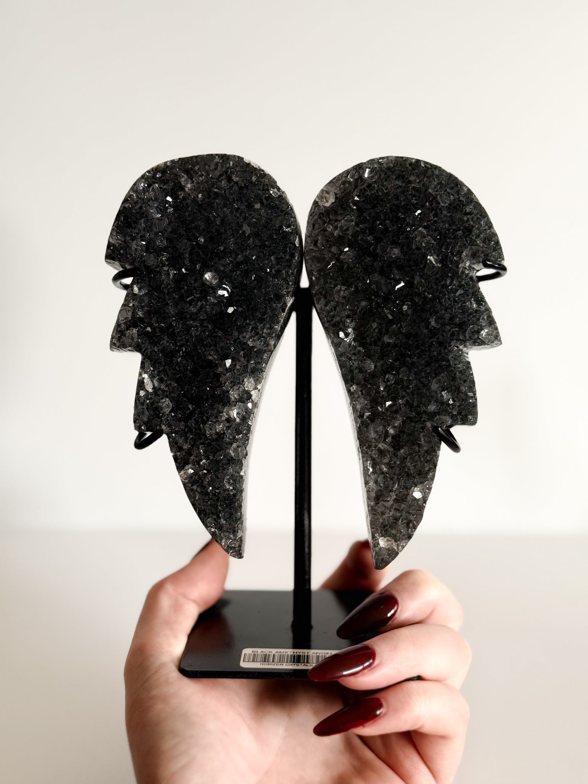 Black Amethyst Angel Wings on Custom Stand Sourced directly from Brazil, these striking black amethyst angel wings showcase the deep, lustrous beauty of premium amethyst crystal. Each pair is meticulously carved into elegant wing formations, displaying the natural banding and crystalline structure characteristic of high-quality specimens. Mounted on a custom stand, these wings serve as both a sophisticated decorative piece and a meaningful addition to any crystal collection. The protective, symbolic nature of angel wings combined with amethyst's renowned calming properties makes this an ideal choice for those seeking spiritual enhancement or refined home décor. A distinctive statement piece that captures the raw elegance of Brazilian gemstones.