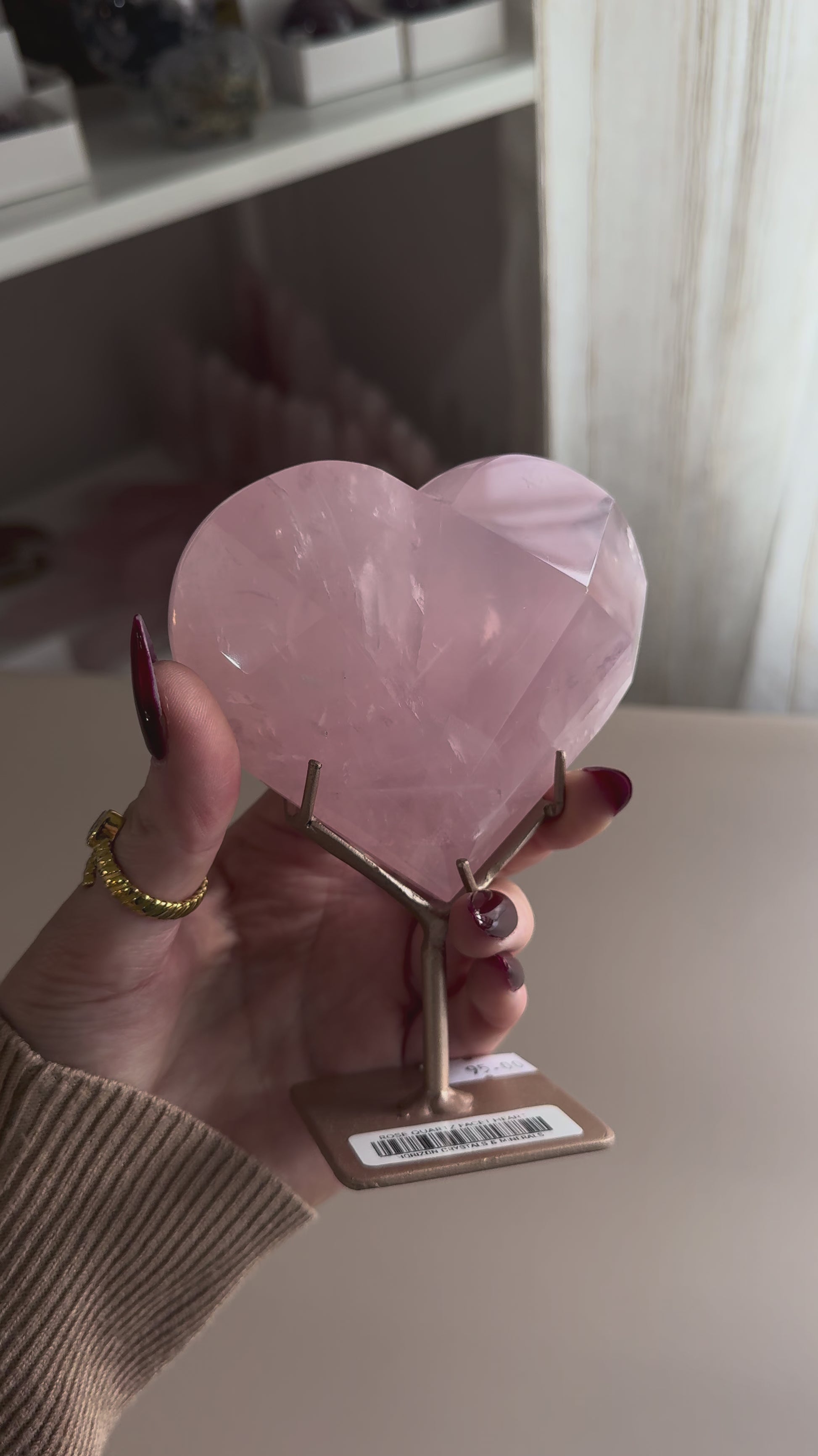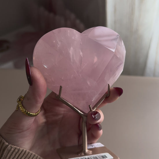This Brazilian rose quartz heart showcases masterful faceting that transforms the stone's soft pink tones into a luminous display piece. Each precisely cut facet catches and refracts light, creating dynamic visual depth and brilliance. Mounted on a refined gold stand, the piece is designed for prominent display in any collection. The combination of meticulous gemstone cutting and quality metalwork demonstrates the artistry involved in creating statement pieces for serious collectors. Perfect for those who appreciate fine mineral specimens and exceptional craftsmanship.